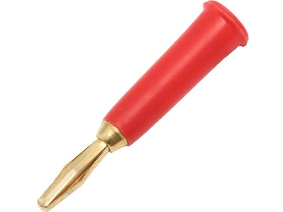 Pozłacany wtyk bananowy lutowany w czerwonej obudowie.
