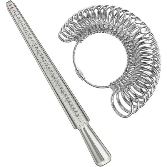 - Stalowa miarka jubilerska ułatwiająca ustalenie rozmiarów pierścionka i obrączki.