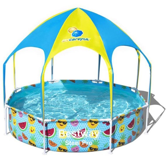 Model Play Pool to basen okrągły o ciekawym designem z zadaszeniem. Ma solidną konstrukcję oraz materiał o wysokiej jakości i wytrzymałości na zniszczenia. Wzory na materiale przyciągają uwagę i sprawiają, że zabawa jest jeszcze fajniejsza. Zadaszenie chroni przed nadmiernym nasłonecznieniem, szczególnie najmłodszych. Dodatkowo basen jest szybki w montażu - szacuje się, że 2 osoby złożą go w 10 minut. Należy jedynie pamiętać o ustawieniu na równej nawierzchni, co zapewni bezpieczne i komfortowe użytkowanie