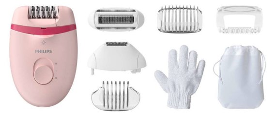 Depilator Satinelle Essential zasilany sieciowo. Wyposażony w głowicę z dyskami depilującymi. Zestaw zawiera głowicę golącą oraz trymer okolic bikini. Lampka Opti-light ułatwiająca precyzyjną depilację.