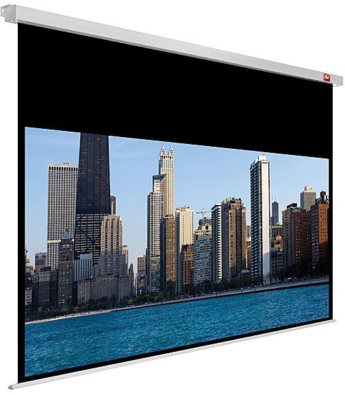 Ekran projekcyjny ścienny o wymiarach powierzchni projekcyjnej 230 x 172.5 cm w formacie 4:3. Płaska powierzchnia dolna obudowy.