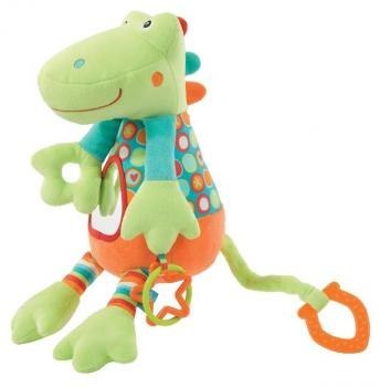 Mięciutka maskotka która stanie się nierozłącznym przyjacielem twojego maluszka. Idealna do przytulania i do zabawy. Wystarczy pociągnąć za ogonek na którym jest zawieszony gryzaczek a zacznie on delikatnie wibrować. Na brzuszku krokodyl ma umieszczone bezpieczne lusterko, do rączek doczepione grzechochoczące zawieszki. W pluszowym zwierzątku ukryte są równieżpiszczki, grzechotki i dzwoneczki.