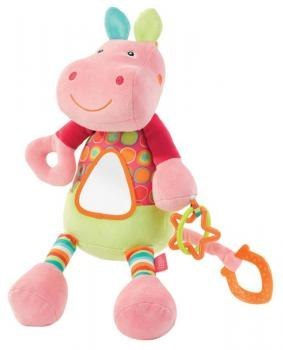 Mięciutka maskotka która stanie się nierozłącznym przyjacielem twojego maluszka. Idealna do przytulania i do zabawy. Wystarczy pociągnąć za ogonek na którym jest zawieszony gryzaczek a zacznie on delikatnie wibrować. Na brzuszku hipopotam ma umieszczone bezpieczne lusterko, do rączek doczepione grzechochoczące zawieszki. W pluszowym zwierzątku ukryte są równieżpiszczki, grzechotki i dzwoneczki.