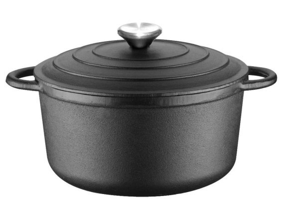 Garnek 5.5L wykonany z odlewu żeliwa. Bardzo ciężki. Bez żadnych powłok konserwujących, czyste żeliwo. Pozbawione kantów profilowane dno ułatwiają nakładanie potraw jak i utrzymanie garnka w czystości. Jest odporny na ścieranie i wysokie temperatury. Głęboki, idealny do smażenia i pieczenia. Pokrywa żeliwna z uchwytem ze stali nierdzewnej.