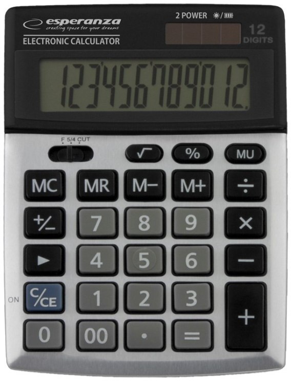 Kalkulator biurkowy z dużym, 12 cyfrowym wyświetlaczem. Posiada wszystkie podstawowe funkcje matematyczne (dodawanie, odejmowanie, mnożenie, dzielenie, pierwiastkowanie, obliczanie procentów.
