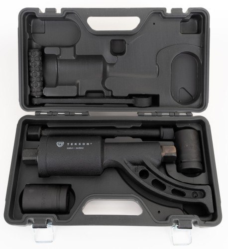 Klucz Przekładniowy 1:58 Z Długą Rączką Zastosowanie Oferujemy Państwu klucz przekładniowy 1:58 z długą rączką (planetarny), wykonany z wysokogatunkowej stali stopowej powstałej w procesie dokładnej obróbki cieplnej. Klucz ten posiada przełożenie 1:58 i moment obrotowy 5200 Nm, dzięki czemu bez trudu poradzi sobie ze wszystkimi rodzajami nakrętek, szpilek itp. Dzięki swojej sile wynikającej z mechanizmu przekładniowego, klucz poradzi sobie nawet z opornymi śrubami, przez to osoba korzystająca z klucza traci o wiele mniej energii! Specyfikacja Wysokiej jakości klucz przekładniowy (planetarny) Przełożenie 1:58 Moment obrotowy 5200Nm Poluzowuje najmocniejsze nakrętki kół w ciężarówkach i innych ciężkich pojazdach Wykonany z wysokogatunkowej stali stopowej w procesie dokładnej obróbki cieplnej W komplecie 2 nasadki o wymiarach 32 mm oraz 33 mm Rękawice ochronne w zestawie Całość zapakowana w czarna walizkę Solidnie wykonany Łatwy w użytkowaniu Waga razem z opakowaniem: 7,8 kg Użytkowanie Żeby bez przeszkód korzystać z klucza wystarczy zamontować kolbę oraz nasadkę i przyłożyć klucz do koła. Kolejnym krokiem jest zablokowanie stopki oporowej o najbliższą sąsiadującą śrubę. Po wykonaniu powyższych czynności można bez problemu rozpocząć odkręcanie lub dokręcanie śrub, a jest to niezwykle proste dzięki wygodnej rączce oraz dokładnemu wykonaniu klucza, który idealnie leży w dłoni ! Zawartość zestawu klucz dynamometryczny nasadka 32 mm nasadka 33 mm kolba długa rączka rękawice ochronne instrukcja czarna walizka