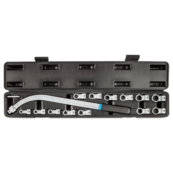 Klucz do demontażu napinaczy: odgięta rękojeść, wymienne końcówki TORX: E10, E12, E14, E16, E18; oczkowe 12 kątne: 12, 13, 14, 15, 16, 17, 18, 19 mm