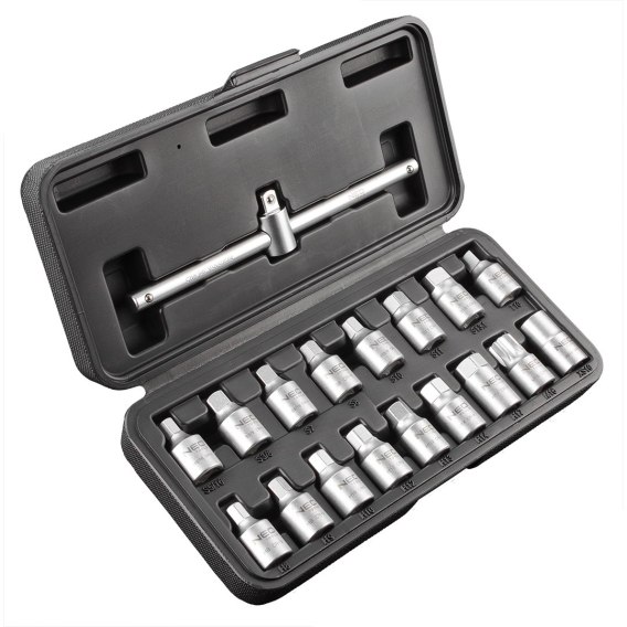 Klucze do spustu oleju 3/8", zestaw 18 szt. 3/8" klucz przelotowy z pokrętłem, 7 nasadek sześciokątnych (Hex) - męskie: 8, 9, 10, 12, 13.1, 14, 17 mm, 7 szt. typu kwadrat - męskie: 7, 8, 10, 11, 13.1 mm, 5, 16, 3, 8, typu kwadrat - żeńska: 10 mm, typu trójkąt - męska: 10 mm, typu spline z otworem (Tamper Proof) M16, certyfikat TÜV M+T