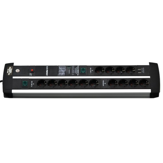 Listwa przeciwprzepięciowa Premium Line wyróżnia się przede wszystkim filtrem EMI/RFI i dużą ilością gniazd (14). Listwa została wyposażona w warystor o czasie reakcji 25<ms. 14 gniazd znajdujących się w konfiguracji: 4 gniazda z wyłącznikiem w górnym rzędzie + 2 gniazda USB z prądem wyjściowym 3,10 A. W dolnym rzędzie znajduje się 6 gniazd z wyłącznikiem + 4 gniazda bez wyłącznika. Wszystkie gniazda posiadają ochronę Child Protect i uziemienie. Wszystkie gniazda są typu niemieckiego (schuko). Ochrona przepięciowa listwy Premium line to aż 120 000A. Dodatkowo praktyczna obudowa umożliwiająca zwinięcie zbędnej długości kabla wzdłuż obudowy i uchwyt umożliwiający montaż listwy na ścianie.