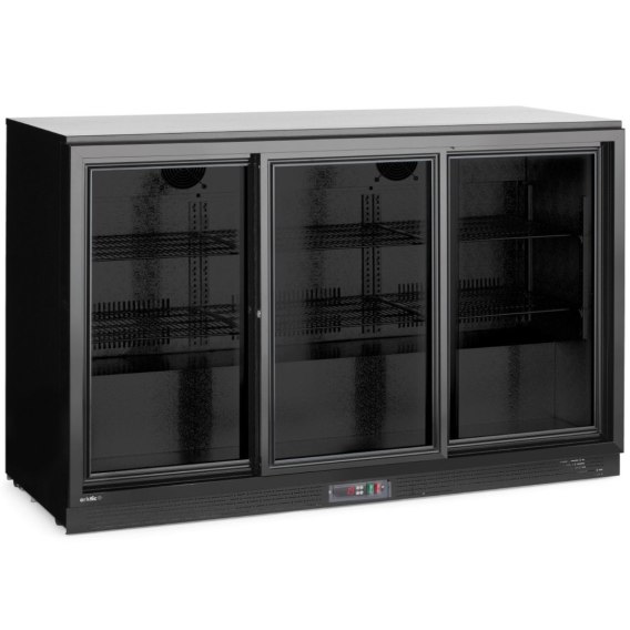 Lodówka barowa 3-drzwiowa Arktic łączy w sobie elegancki design, trwałość i energooszczędność, zapewniając optymalne warunki przechowywania napojów. Komora została wykonana z tłoczonego aluminium i jest wyposażona w oświetlenie LED. Samozamykające się drzwi z podwójną szybą posiadają zamek z kluczykiem. Rama drzwi została wykonana z tworzywa sztucznego, a przednia szyba ze szkła hartowanego. Agregat został umieszczony pod komorą. Lodówka posiada funkcję automatycznego odszraniania. Chłodzenie statyczne wspomagane jest wentylatorem. Elektroniczny panel sterowania posiada cyfrowy wyświetlacz temperatury.