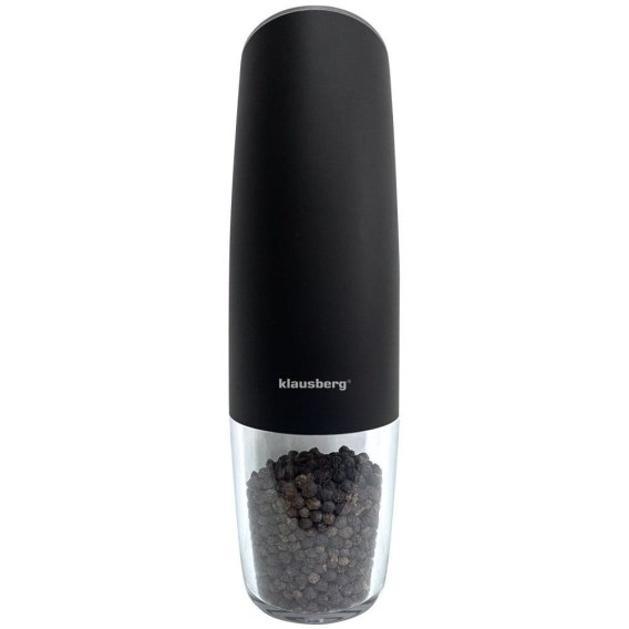 Grawitacyjny akumulatorowy młynek elektryczny do soli lub pieprzu firmy KLAUSBERG. Bardzo łatwy w użyciu! Wystarczy przekręcić młynek do góry nogami i automatycznie zacznie pracę, odchylić i przestanie mielić. Wykonany z antypoślizgowego tworzywa sztucznego w matowym kolorze czarnym. Obudowa z okienkiem wskazującym poziom zawartości ziaren. Wydajny silnik który bez trudu radzi siebie z każdym rodzajem pieprzu lub soli. Odporny na korozję ceramiczny mechanizm do ścierania z regulacją grubości mielenia.