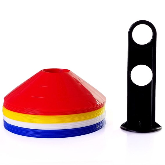 Talerze treningowe z otworem na szczycie wykonane z tworzywa sztucznego do różnego rodzaju treningów, ćwiczeń, gier i zabaw. W opakowaniu stojak oraz 40 pachołków.