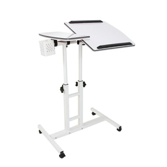 Uniwersalny stolik do laptopa na kółkach. Posiada 2 blaty z niezależnie od siebie regulowanym położeniem oraz wysokością. Kompaktowe rozmiary sprawiają, że świetnie sprawdzi się w nawet najmniejszym pomieszczeniu. Kółka posiadają blokadę zapobiegającą niepożądanemu przemieszczaniu się stolika podczas użytkowania. Blaty akrylowe. Gratis organizer na przybory do pisania.