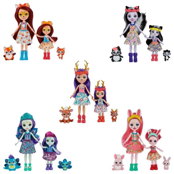 Poznaj siostrzyczki Enchantimals Urocze i sympatyczne siostry Enchantimals starsza 15 cm i młodsza 10 cm uwielbiają robić wszystko razem Do wyboru są: Bree Bunny, Felicity Fox, Danessa Deer, Patter Peacock i Sage Skunk z młodszymi siostrzyczkami Każda lalka ma też do towarzystwa figurkę zwierzątka Dzieci pokochają wyjątkową więż łączącą te siostry Enchantimals Zestaw z 2 lalkami i 2 figurkami zwierzątek zapewnia mnóstwo wesołej zabawy dla najmłodszych Zestawy sprzedawane oddzielnie, zależnie od dostępności Kolory i elementy dekoracyjne mogą się różnić