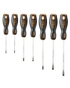 Zestaw wkrętaków NEO zawiera 7 wkrętaków: płaskie i krzyżowe. Grot wkrętaka wykonany jest z wyjątkowo wytrzymałej stali S2. Końcówka robocza grota została poddana obróbce cieplnej, dzięki czemu uzyskano odpowiednią twardość i odporność na zgięcia. Wkrętak posiada magnetyczną końcówkę. Trójgraniasty kształt uchwytu z wyprofilowanym oparciem dla kciuka zmniejsza obciążenie dłoni podczas pracy i ułatwia uzyskanie optymalnego momentu obrotowego. Uchwyt dwumateriałowy zapobiega ślizganiu się w dłoni, odporny jest na działanie chemikaliów, olejów i smarów. Jakość narzędzia potwierdzona 25-letnią gwarancją producenta. Marka NEO spełnia oczekiwania profesjonalistów.