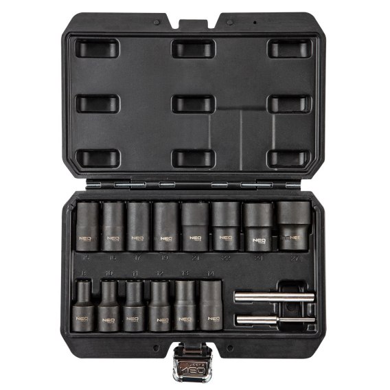 Nasadki 1/2", do uszkodzonych nakrętek.W zestawie: 8, 10, 11, 12, 13, 14, 15, 16, 17, 19, 21, 22, 24, 27 mm. 2 wybijaki do usuwania śrub z nasadek. Można stosować z kluczami udarowymi. Wewnętrzna spirala powoduje samoczynne zaciskanie się na uszkodzonej śrubie/nakrętce umożliwając bezpieczne odkręcenie.