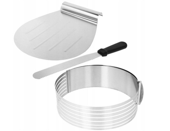 Wysokiej jakości regulowana, okrągła forma z łopatką i dedykowanym nożem do równego krojenia ciast, tortów oraz biszkoptów. Specjalna konstrukcja ułatwia krojenie ciast na 7 idealnie równych blatów. Zestaw jest niezwykle pomocny przy przygotowywaniu wypieków z dodatkami. Uchwyt ze stali nierdzewnej umożliwi ci zawieszenie noża. Akcesoria wykonane ze stali nierdzewnej są wyjątkowo odporne na zniszczenie, łatwe w czyszczeniu i lekkie.