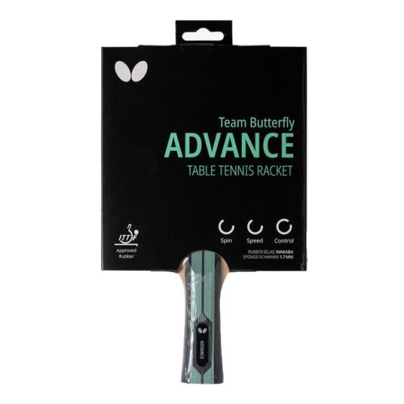 Rakietka do tenisa stołowego oferująca doskonałe właściwości gry dla wszechstronnych graczy z tendencją do ataku, dzięki gumom Wakaba (grubość gąbki 1,7 mm, pomiędzy górną gumą) z atestem ITTF. Team Butterfly Advance pozwala graczowi uderzać mocno i bezpośrednio, aby wymusić zwycięstwo punktowe, nie tracąc przy tym zbytniej kontroli.