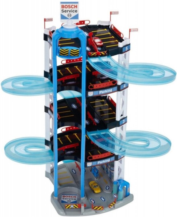5 piętrowy parking garaż Theo Klein zestaw można złożyć w 1 lub 3 lub 5 pięter, zawiera windę, którą można "wciągnąć" resoraki na wyższe piętra, oraz myjnię na poziomie 0