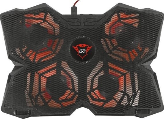 Podstawka chłodząca do notebooka max. 17.3 cala, koloru czarnego. Wyposażona w 4 wentylatory z czerwonym podświetleniem. Posiada funkcję regulacji prędkości wentylatora. Wbudowany schowek na przewód.