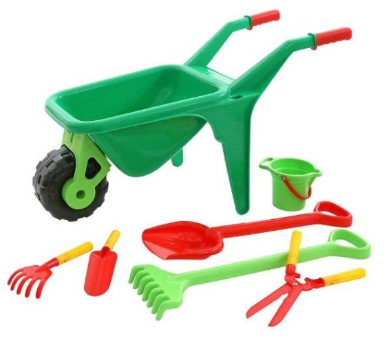Duża solidna plastikowa taczka z zestawem narzędzi dla ogrodnika. W zestawie wysokiej jakości narzędzia (łopatka, grabki, mała łopatka ogrodowa, małe grabki ogrodowe, małe wiaderko, sekator). Cały zestaw cechuje się dużą wytrzymałością. Zabawka wykonana z wysokiej jakości materiałów.