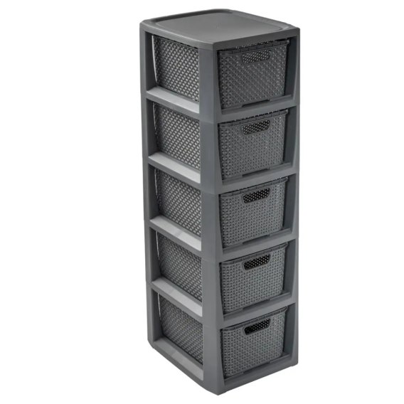 Pięcioczęściowy regał Rattan jest bardzo dobrym rozwiązaniem do przechowywania w małych przestrzeniach. Wykonany bardzo estetycznie, z wysokiej jakości, bezpiecznego materiału (wolnego od ftalanów i bpa) jest idealny do takich pomieszczeń jak łazienka, garderoba, dziecięcy pokój czy domowe biuro. Dostępny w różnych kolorach.