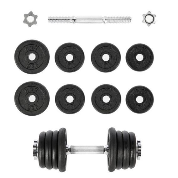 W skład zestawu wchodzą: gryf prosty 2 kg, 2 talerze 1,25 kg, 4 talerze 1,5 kg, 2 talerze 2 kg oraz 2 zaciski gwiazdowe 0,25 kg. Pierwszy z elementów został wykonany ze stali niklowanej. Z kolei talerze są żeliwne.