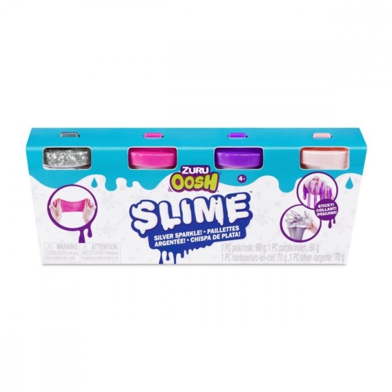 Zawsze jest czas na zabawę slimem Oosh by ZURU! Ściśnij slima, aby poczuć, jak wycieka między palcami, lub rozciągnij i pociągnij, aby zobaczyć, jak się porusza! Oosh jest nietoksyczny, nieklejący i świetnie redukuje stres! 4-pak zawiera slim kolorze: różowym, fioletowym, srebrnym i tęczowym.