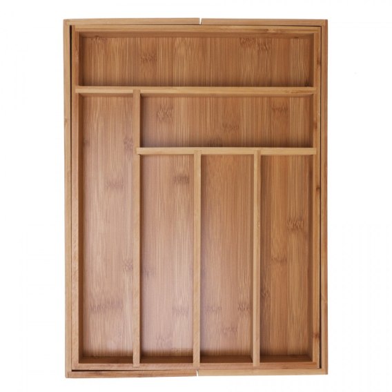 Wkład na sztućce z drewna bambusowego KINGHOFF. Dzięki regulowanemu rozmiarowi można dopasować go do szuflad o szerokości od 31 do 52cm.