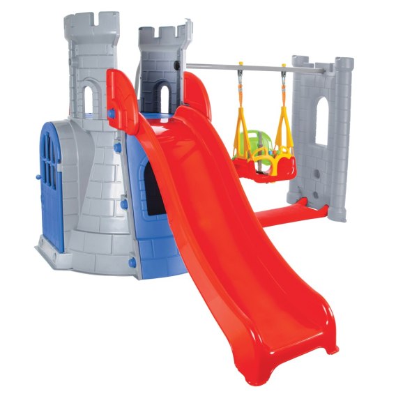 Plac Zabaw Zamek jest ogromną twierdzą do zabawy dla Twojego dziecka i jego przyjaciół! Plac zbudowany jest z wieży ze zjeżdżalnią oraz huśtawki typu swing. Wieża posiada liczne okna i otwory, przez które wpada dużo światła. Dodatkowo można z niej wyjść przez boczne drzwi i za pomocą schodków z trwałymi poręczami wejść na górę wieży i zjechać ze zjeżdżalni o długości ślizgu 166 cm. Wieża posiada wysokie boczne zabezpieczenia chroniące dziecko podczas korzystania ze zjeżdżalni, która madługi, dość stromy śliz w pełni zadowalający każde dziecko. Cudowny plac uzupełnia miejsce z huśtawką typy swing, którą można ustawić na trzy sposoby zależnie od wieku i potrzeb (maksymalne obciążenie 50 kg). Wykonany jest z wysokiej jakości tworzywa sztucznego zabezpieczonego przed promieniowaniem UV - idealny do użytku na zewnątrz oraz doskonały do zabawy w domu!