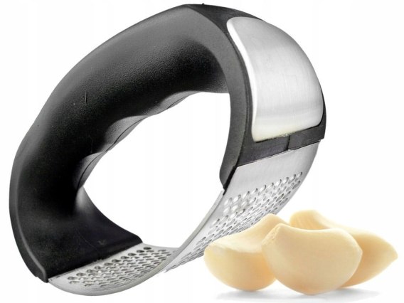 Wyciskacz / Zgniatacz do czosnku wykonany ze stali nierdzewnej z uchwytem z tworzywa sztucznego.