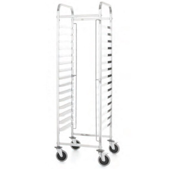 Wózek Kitchen Line do transportu blach 15x600x400. Przeznaczony został do wykorzystania w restauracjach, hotelach, barach szybkiej obsługi a także w firmach cateringowych lub domach weselnych. Konstrukcję wykonano z solidnej, łatwej w montażu i utrzymaniu czystości stali nierdzewnej AISI 201.