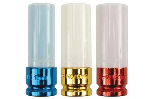 Nasadki posiadają chromowane wykończenie w 3 kolorach, które ułatwia rozróżnienie rozmiarów. Ultra cienkie ścianki umożliwiają odkręcanie śrub w ciasnych gniazdach felg aluminiowych.