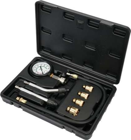 8-częściowy zestaw przeznaczony do pomiaru ciśnienia sprężania w silnikach benzynowych.