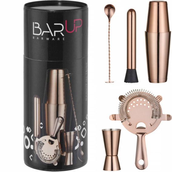 Zestaw barmański w tubie firmy BarUp, to starannie przemyślany i skomponowany zestaw podstawowych, profesjonalnych i niezbędnych narzędzi barmana. Zamknięty jest w estetycznym, tekturowym pudełku w formie tuby, dzięki czemu to również wspaniały pomysł na prezent dla pasjonatów sztuki barmańskiej. Zestaw 5 elementów został wykonany ze stali nierdzewnej AISI 201 z powłoką w kolorze miedzianym z błyszczącym wykończeniem. Shaker bostoński Tin-on-Tin posiada 2 kubki z obciążeniem, o pojemnościach 500 ml i 800 ml. Klasyczny jigger o pojemnościach 50 ml i 25 ml. Sitko barmańskie Hawthorne z profilowanym uchwytem oraz demontowaną sprężyną (ułatwia czyszczenie, można jej też używać jako „spring whisk#8221;) idealnie pasuje do shakera, doskonale odcedza drobne kawałki lodu, owoców i ziół. Muddler (moździerz barmański) z ząbkowaną powierzchnią, do szybkiego rozgniatania kawałków owoców i ziół. Końcówka muddlera wykonana jest z polipropylenu (PP). Spiralna łyżka barmańska o długości 27 cm i pojemności 5 ml z muddlerem (końcówka w kształcie dysku) do szybkiego mieszania drinków z lodem bez rozwadniania ich, do wlewania napojów gazowanych bez spieniania oraz tworzenia warstwowych koktajli. Zestaw umieszczony jest w kartonowej tubie z elegancką grafiką. Elementy zestawu nie nadają się do mycia w zmywarce.